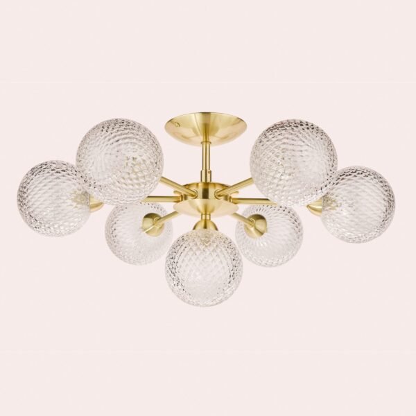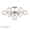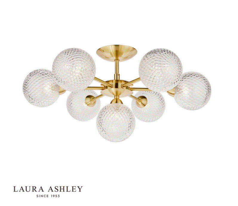 With clear textured glass, the globe shades of the elegant Atherton ceiling light from Laura Ashley partially conceal the light bulbs and cast a sparkly light. Featuring a magnificent seven lights, it has a luxurious contemporary look and, with a nod to the Space Age, great mid-century style. As it is a semi-flush light fitting, the stem conceals the cables, giving a neat finish.