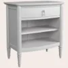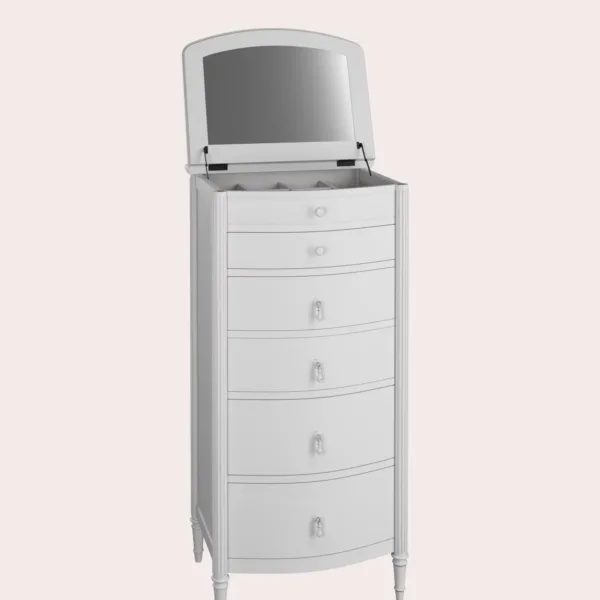 Timeless and elegant, the Bramford 5 Drawer Tall Chest features characteristic reeded details and a washed finish. Bringing a sense of luxury to any home, this gorgeous piece features 5 spacious drawers and a lift-up storage top with an internal mirror. The washed paint finish, using Laura Ashley Pale Ivory paint, subtly reveals the grain of the hardwood beneath, while the complimentary distressed knobs and droplet handles complete the illusion of an heirloom piece from an earlier time.