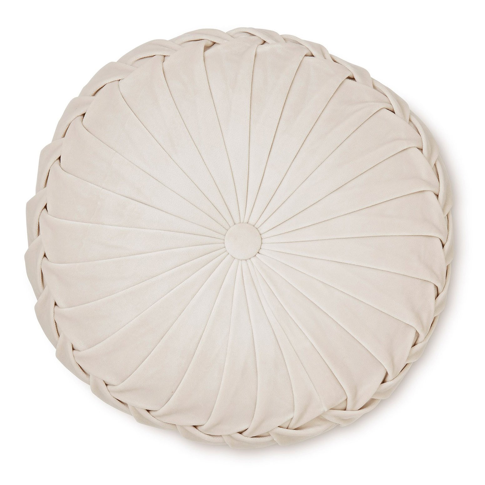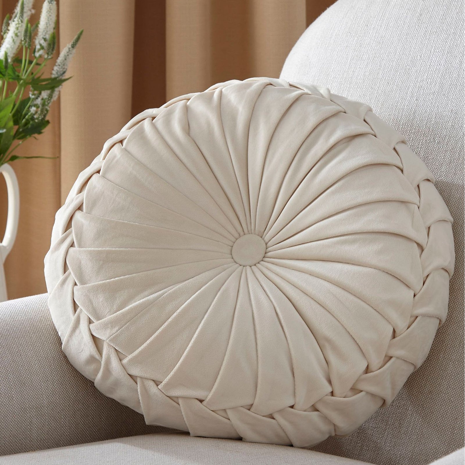 The Rosana decorative pillow has a round shape and an impressive decorative seam. The soft velvet is formed in pleats, forming an elegant braid along the edge of the pillow. The soft fabric and warm but neutral color make it a perfect addition to any interior.