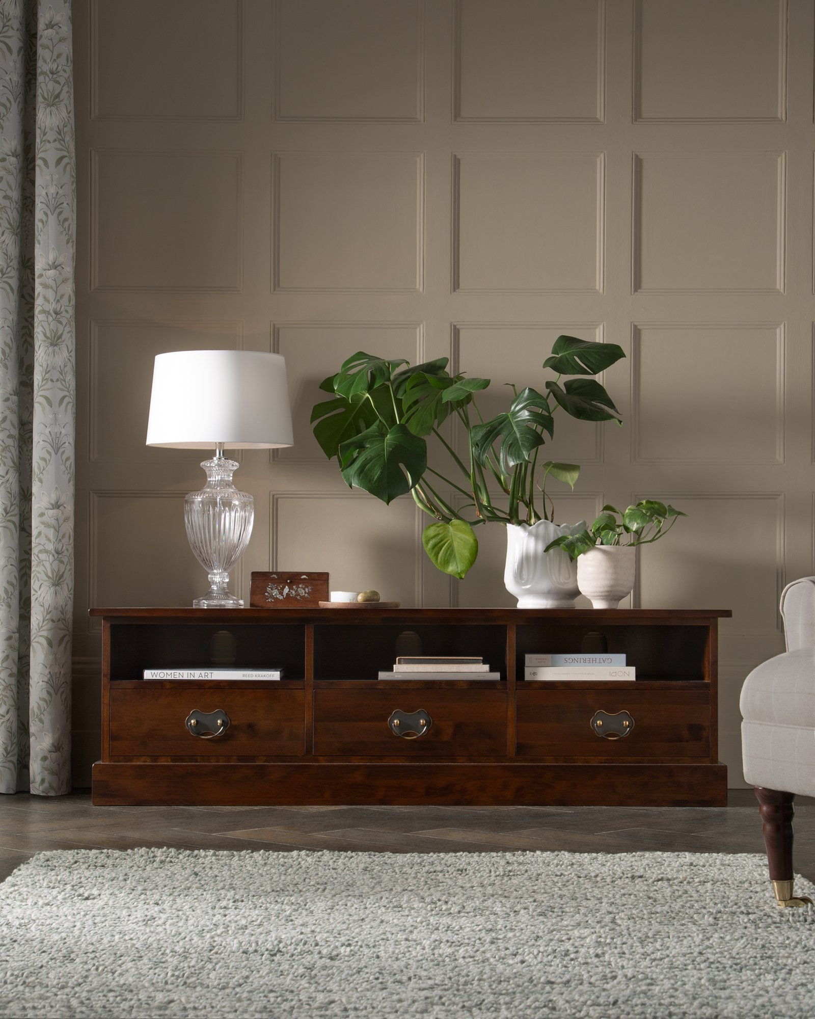 Crafted from predominantly solid birch but with some birch veneer modern materials the Laura Ashley Garrat 3 Drawer TV Unit is a generously sized unit perfect for accommodating flat screen technology. There are three handy drawers and to the rear of the open media sections the backs have been crafted to allow for cable management. The unit has a rippled top and is stained to help enhance the natural wood effects and together with brass effect fittings they combine to give a truly authentic look.
