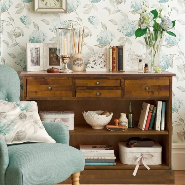 Crafted from predominantly solid birch but with some birch veneer modern materials the Laura Ashley Garrat 4 Drawer Console Table is a useful addition to suit any décor. It benefits from four drawers; two small and two large and in the open section below there is a fixed shelf. It has a rippled top and is stained to help enhance the natural wood effects and has brass effect fittings giving it a truly authentic look.