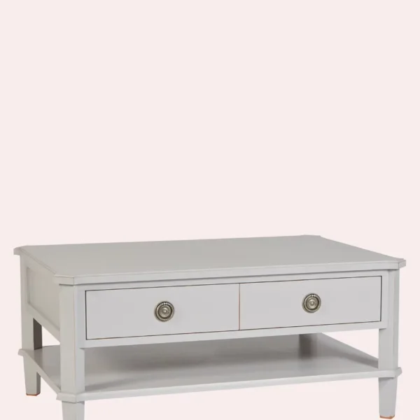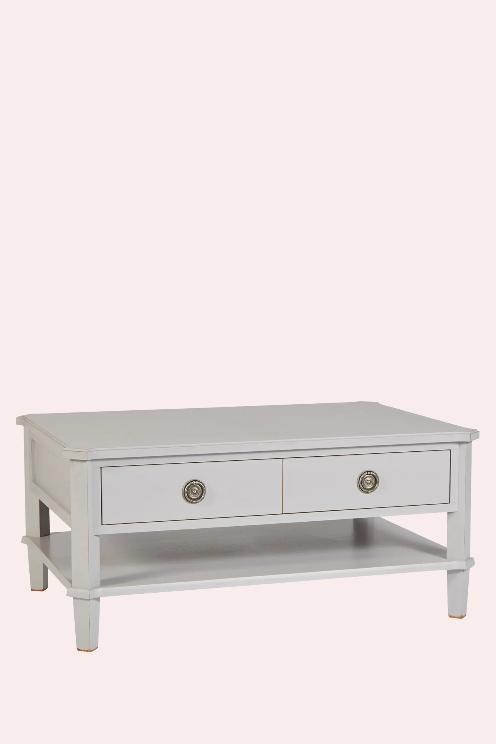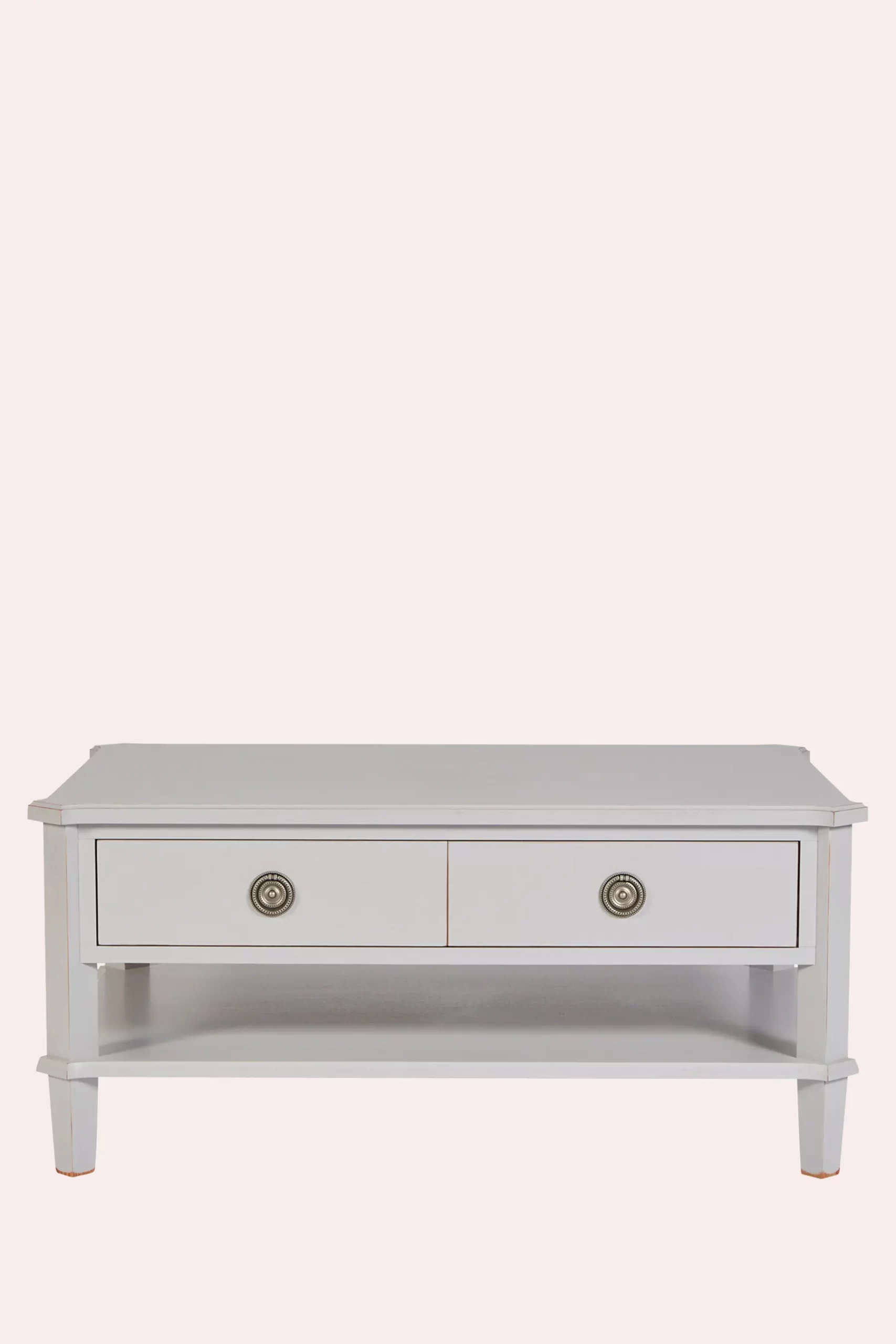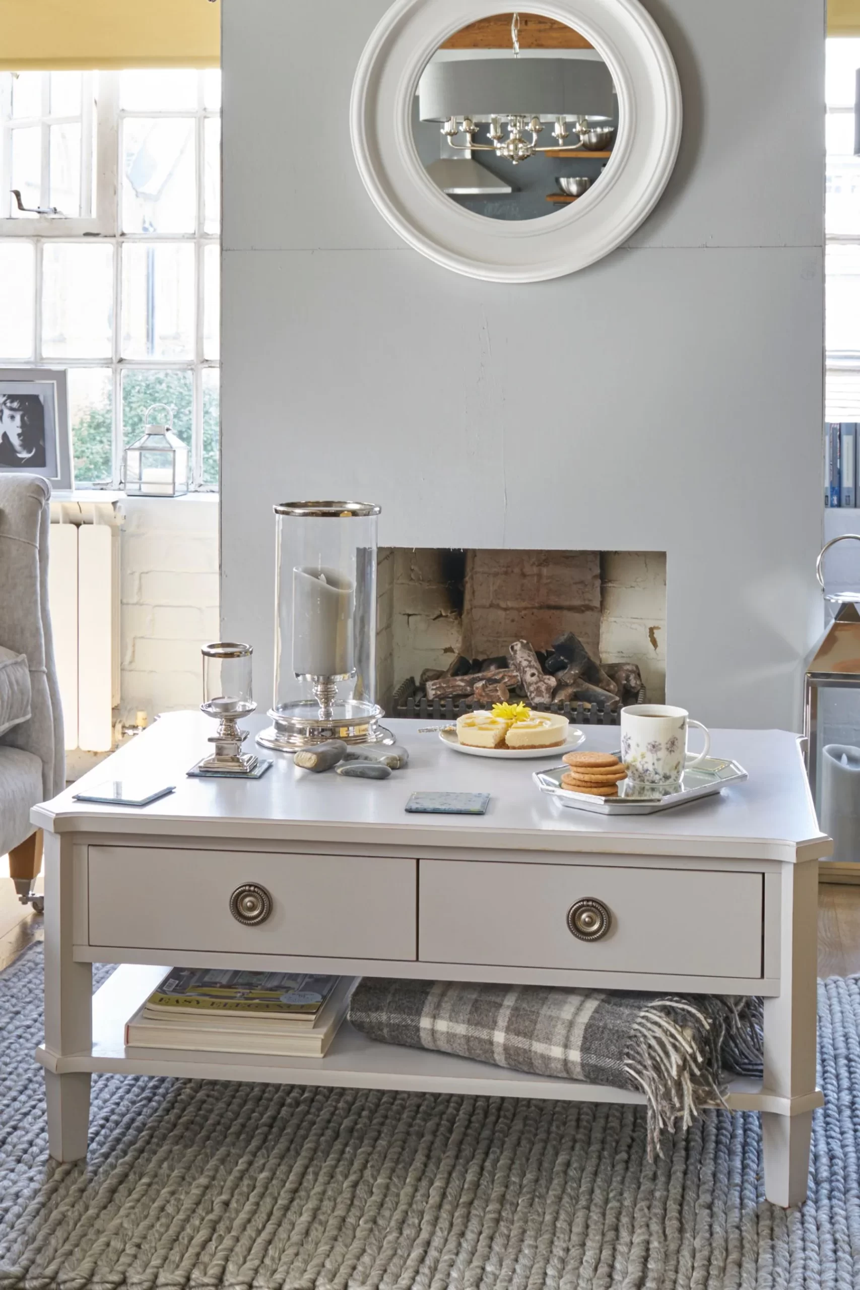 Suiting any decor The Laura Ashley Henshaw 2 Drawer Coffee Table is a practical yet stylish piece. It is crafted from solid wood with some modern materials and is hand painted and finished with a clear lacquer making it low maintenance. The coffee table benefits from two good-sized drawers and a fixed lower shelf. And thanks to subtle distressing on its edges the coffee table displays a gently aged effect so completing its appeal. Only the legs need to be attached to begin enjoying this piece; full assembly is not required.