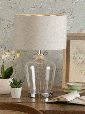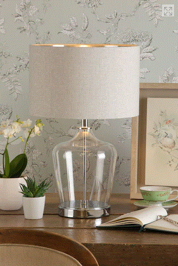 The Ockley Table Lamp by Laura Ashley features a touch on/off polished chrome plinth beneath a clear glass vase. With a three stage touch switch function, simply touch once to turn on and again to dim and then to turn of.