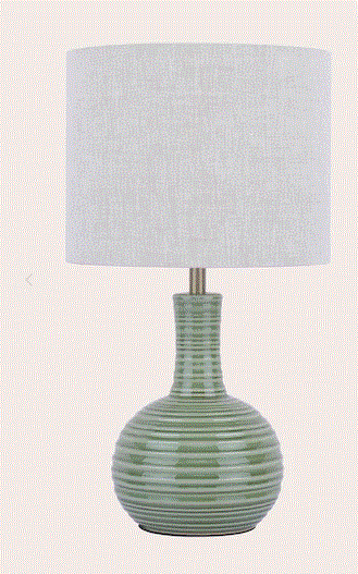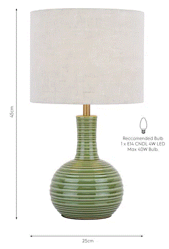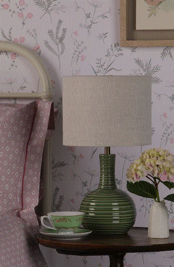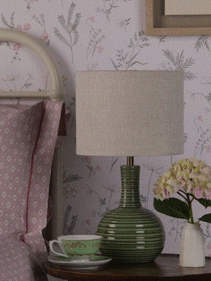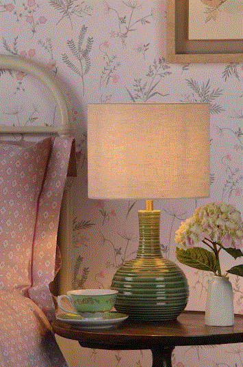 The Padley Table Lamp by Laura Ashley features a rippled ceramic base in a glossy transparent glaze in deep green.