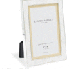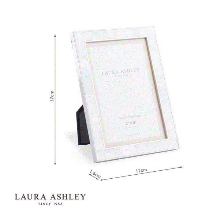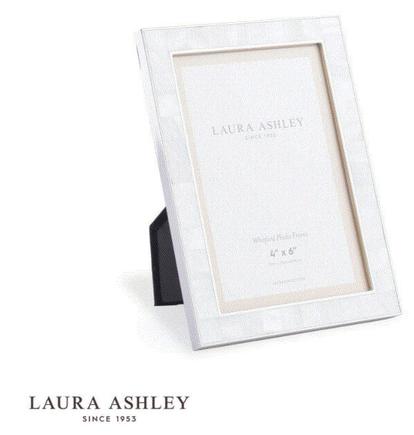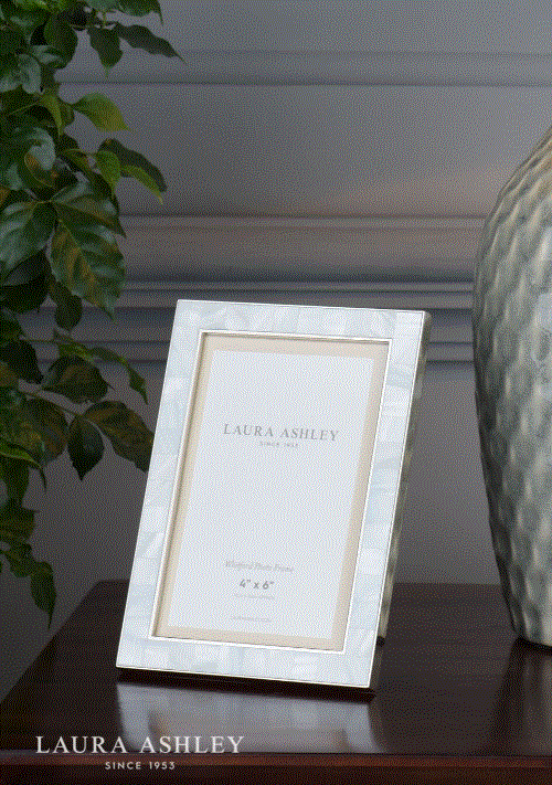 A broad border of iridescent shell is perfectly juxtaposed with the nickel-finish frame in the Whitford photograph frame from Laura Ashley. Subtle, serious, special. Holds one photo. Free standing, for both portrait or landscape orientation. Nickel-plated metal frame, glass fronted, with a black velvet backing.