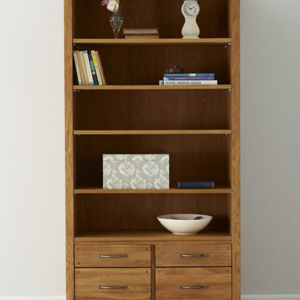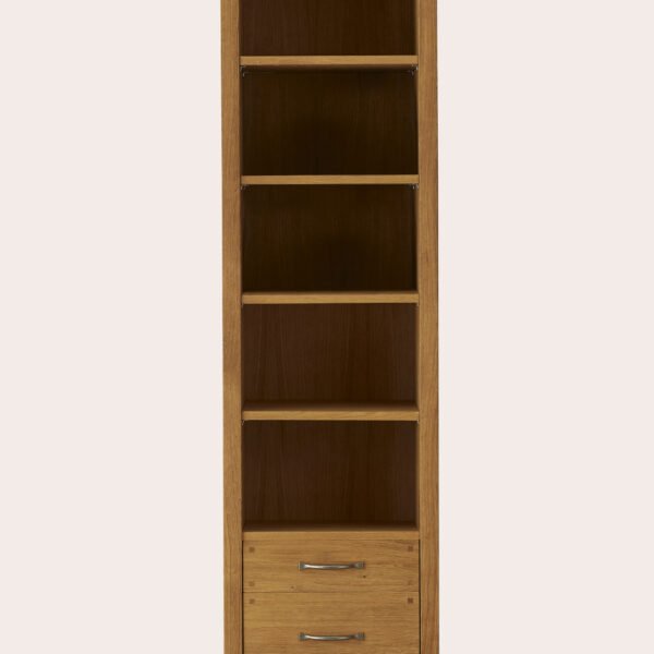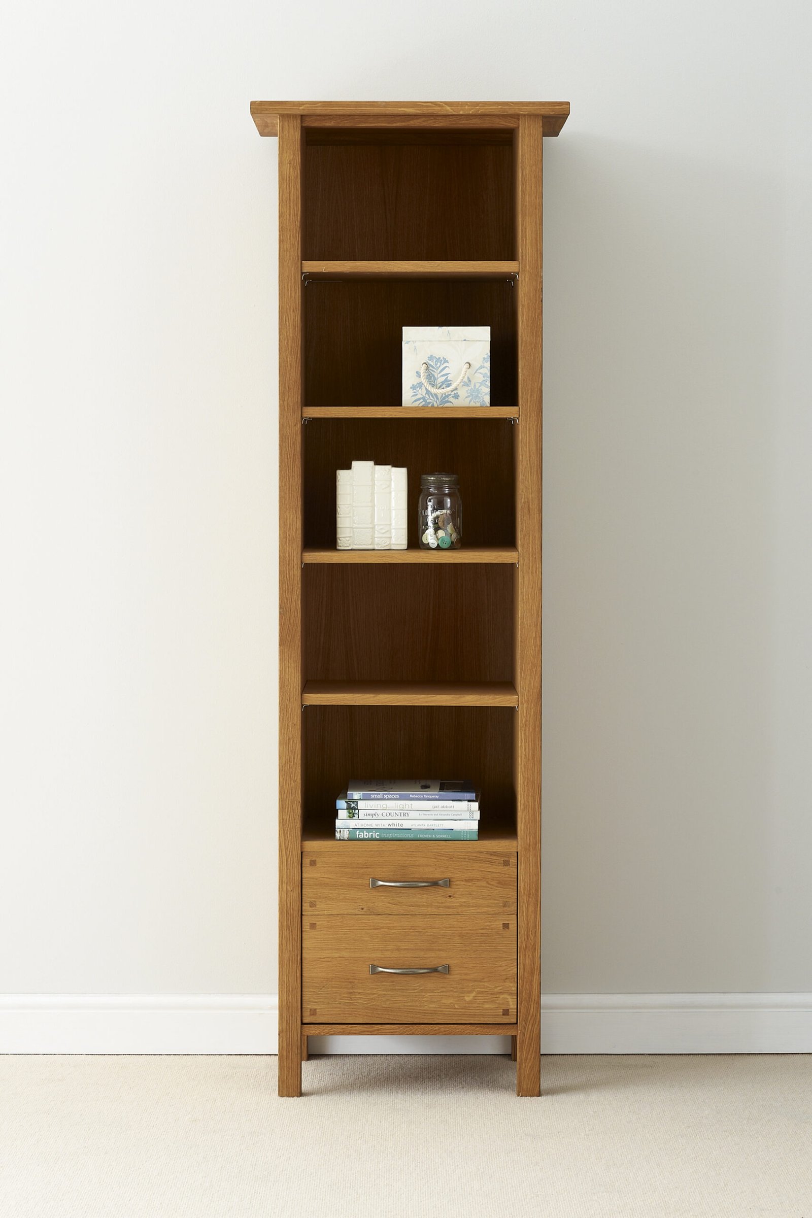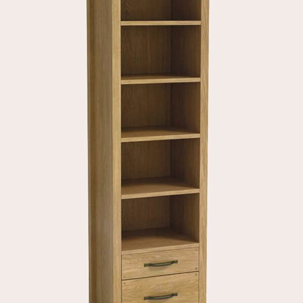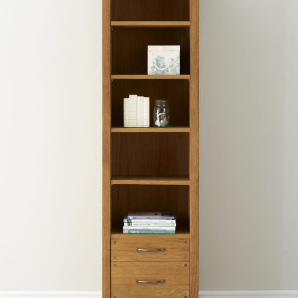 With four adjustable shelves and two drawers for storage the Laura Ashley Milton Oak 2 Drawer Single Bookcase works perfectly in those smaller spaces in the home. It is crafted from a mix of solid oak and oak veneers and is finished with a quality oil resulting in a pure and timeless quality. Antiqued pewter effect handles complete the look of this versatile piece.
