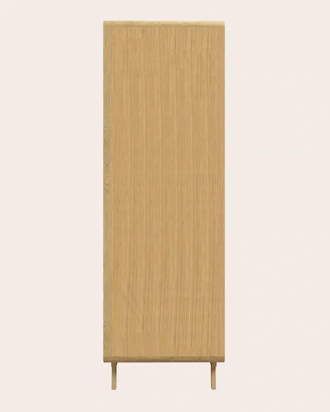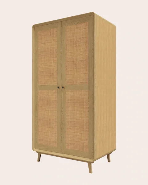 A refined combination of oak and rattan, the Millen 2 Door Wardrobe is a mid-century inspired piece crafted from solid oak and oak veneer featuring rattan door panels and gold hardware. Inside the wardrobe you’ll find a single fixed shelf and wooden hanging rail, offering plenty of space for your clothes. This piece is easy to assemble, requiring only the attachment of the legs.