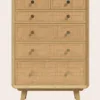 A refined combination of oak and rattan, the Millen 2 Door Wardrobe is a mid-century inspired piece crafted from solid oak and oak veneer featuring rattan door panels and gold hardware. Inside the wardrobe you’ll find a single fixed shelf and wooden hanging rail, offering plenty of space for your clothes. This piece is easy to assemble, requiring only the attachment of the legs.