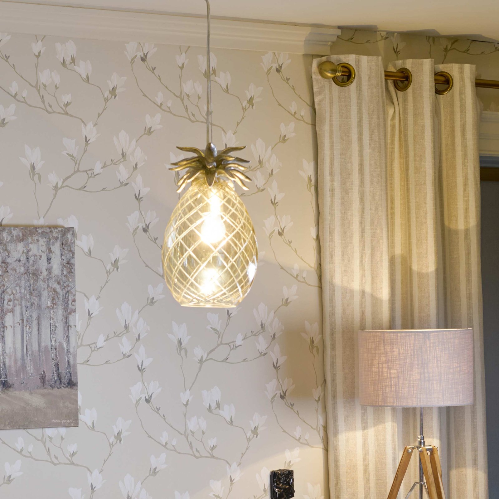 Polished Pineapple will impress you with its charm. Formed by a glass engraved body, with a light matte color of the glass and decorative leaves at the base in champagne color. This chandelier will become the elegant jewel of your room.