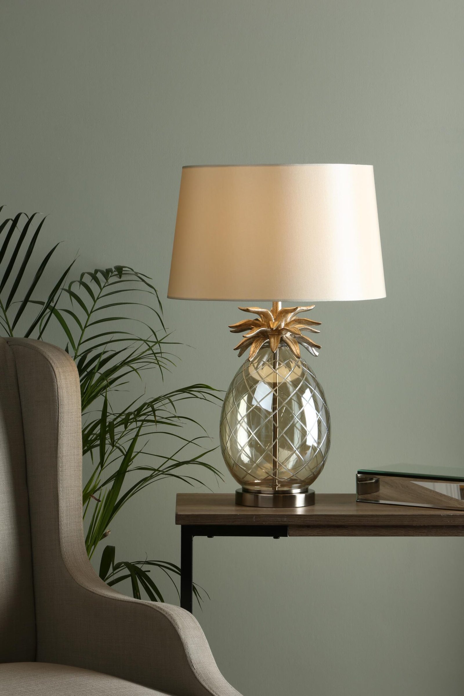 Feeling fruity? Create quirky home style with the small Laura Ashley Pineapple table lamp, and give your room some real character. The base is a pineapple shape, formed from champagne tinted, hand cut glass, and it is topped with resin pineapple leaves and tailed with a flat ring, both painted by hand in champagne gold. Paired with a glamorous taupe faux silk tapered drum shade, this fresh new take on home lighting is a contemporary focal point that will take your living room from dull to delectable. Measurements: H59 x Ø38cm