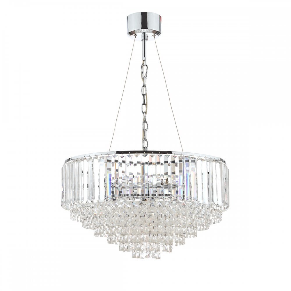 The glamorous 9 light Vienna ceiling light has added magnificence, thanks to its size, and is guaranteed to be a striking focal point in your home. This luxurious statement light features bevelled glass ‘coffin crystal’ rods with a glittering fountain of square-cut faceted glass droplets that fall to a central point, all suspended from a circular frame in a bright, polished chrome finish.