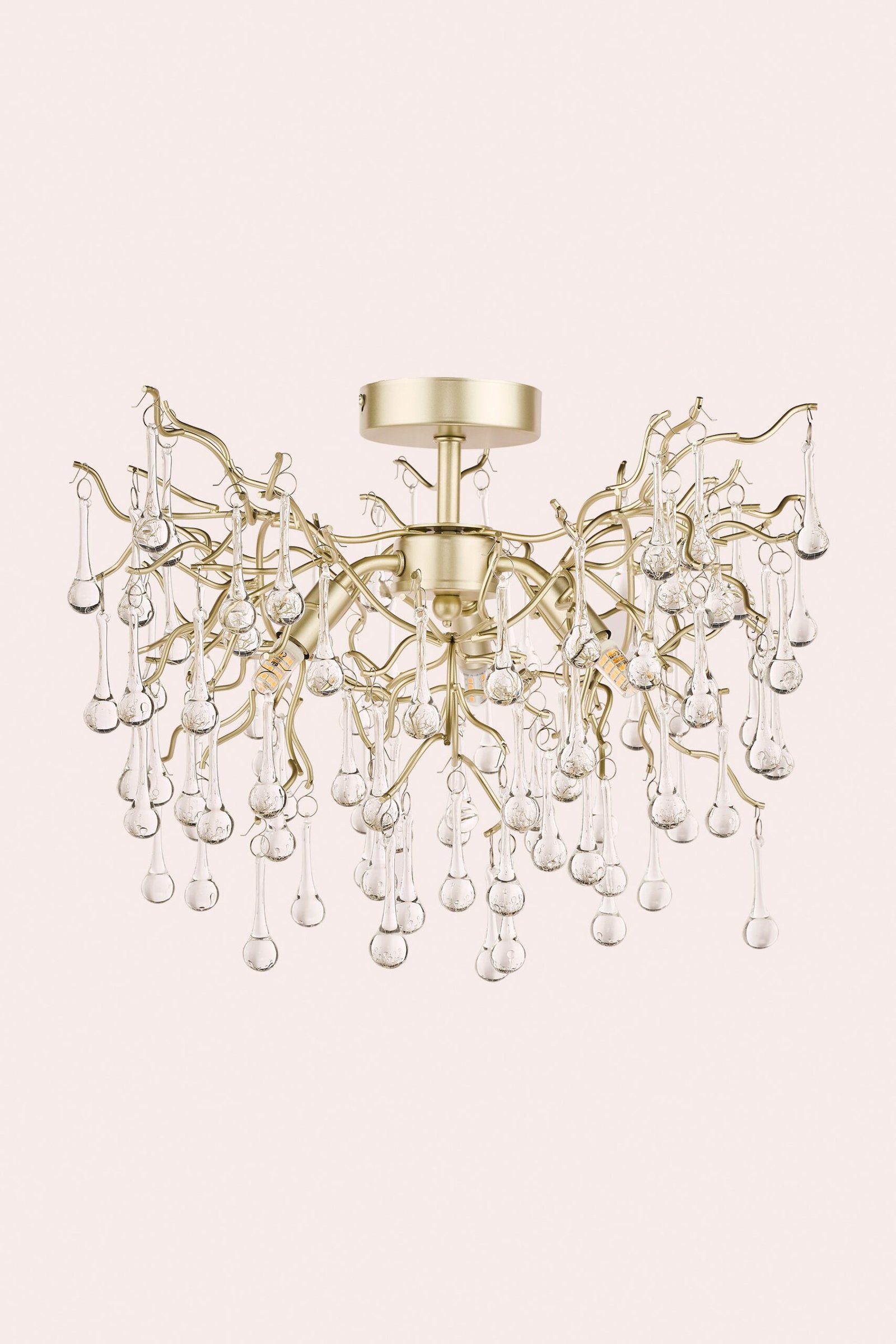 What’s not to like about this gorgeous contemporary chandelier with long crystal raindrops dripping from undulating willow branches? Painted in a soft gold with a satin finish, the Willow semi-flush ceiling light from iconic brand Laura Ashley is bright and pretty.