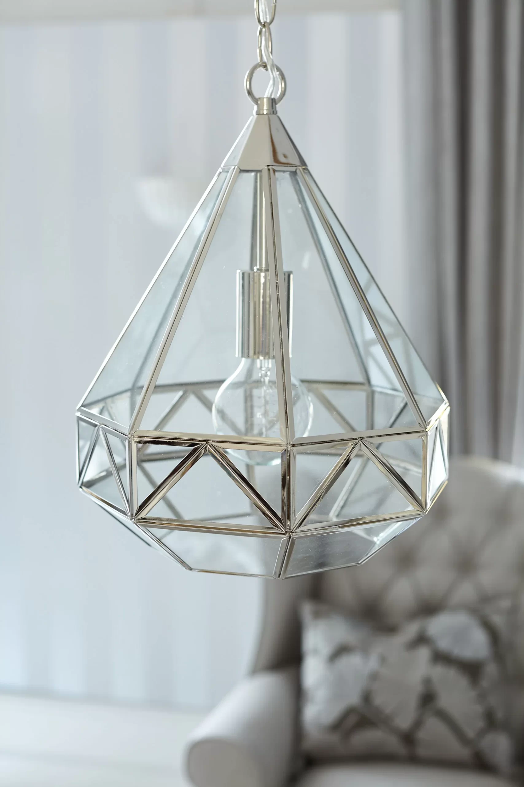 A thoroughly modern, lantern-style ceiling pendant, the Zaria from Laura Ashley features a geometric glass frame with a timeless, warm chrome finish, allowing it to slip seamlessly into any number of interior schemes. Fitting, matching ceiling rose and hanging chain included, plus a coordinating gold cable. Bulb not included; takes 1 x 60W max ES GLS. Height is adjustable at the point of installation (40–105cm).